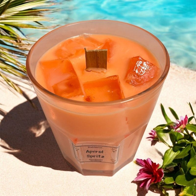 Genieße die erfrischende und belebende Atmosphäre des Sommers mit unserer Duftkerze "Aperol Spritz". Der spritzige Duft von sonnengereiften Orangen und spritzigen Zitronen erinnert an den beliebten italienischen Aperitif und verbreitet gute Laune. Die Kerze besteht aus 330g natürlichem Sojawachs und einem einzigartigen Gelee, das für eine lange Brenndauer und einen intensiven Duft sorgt.